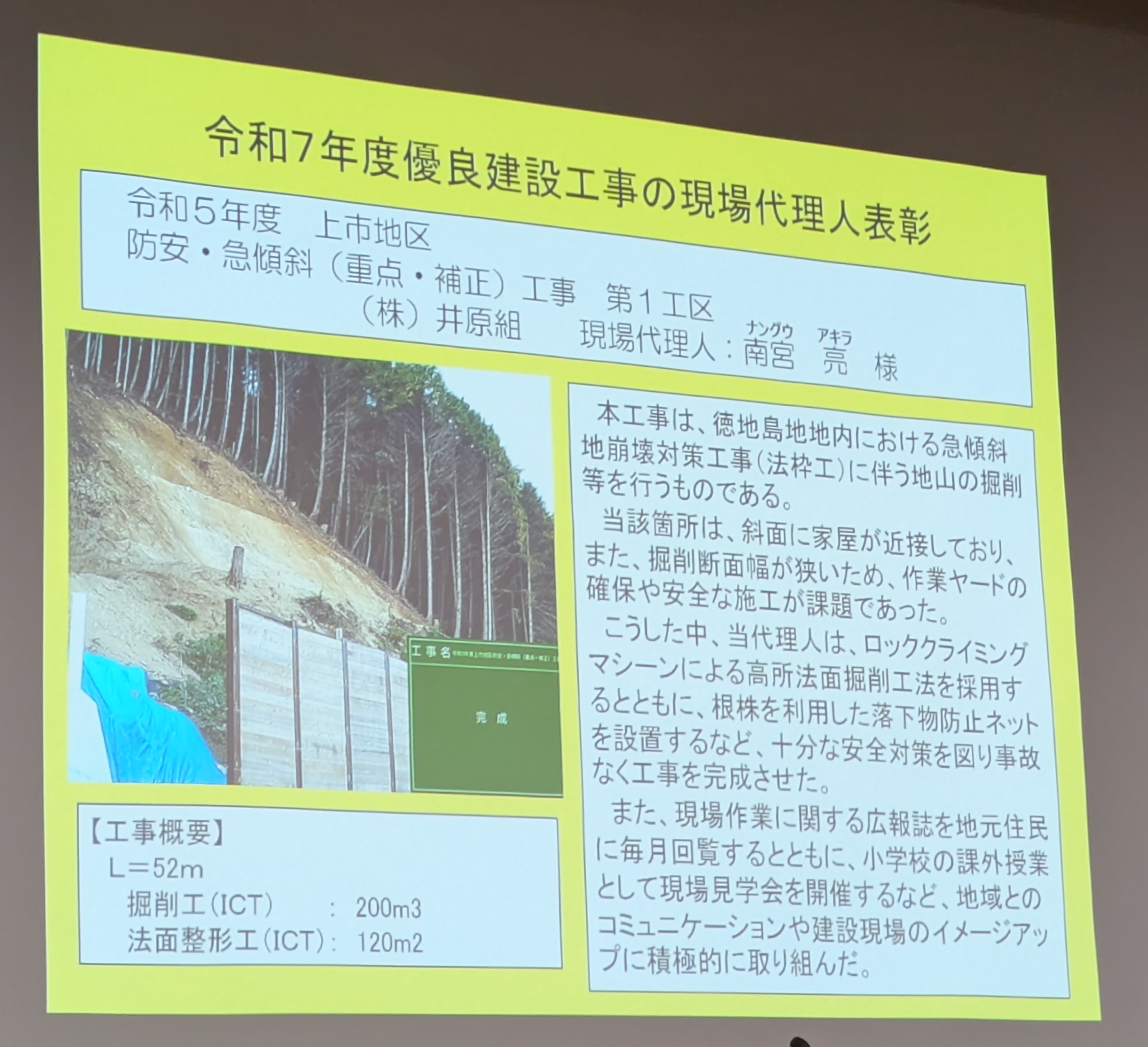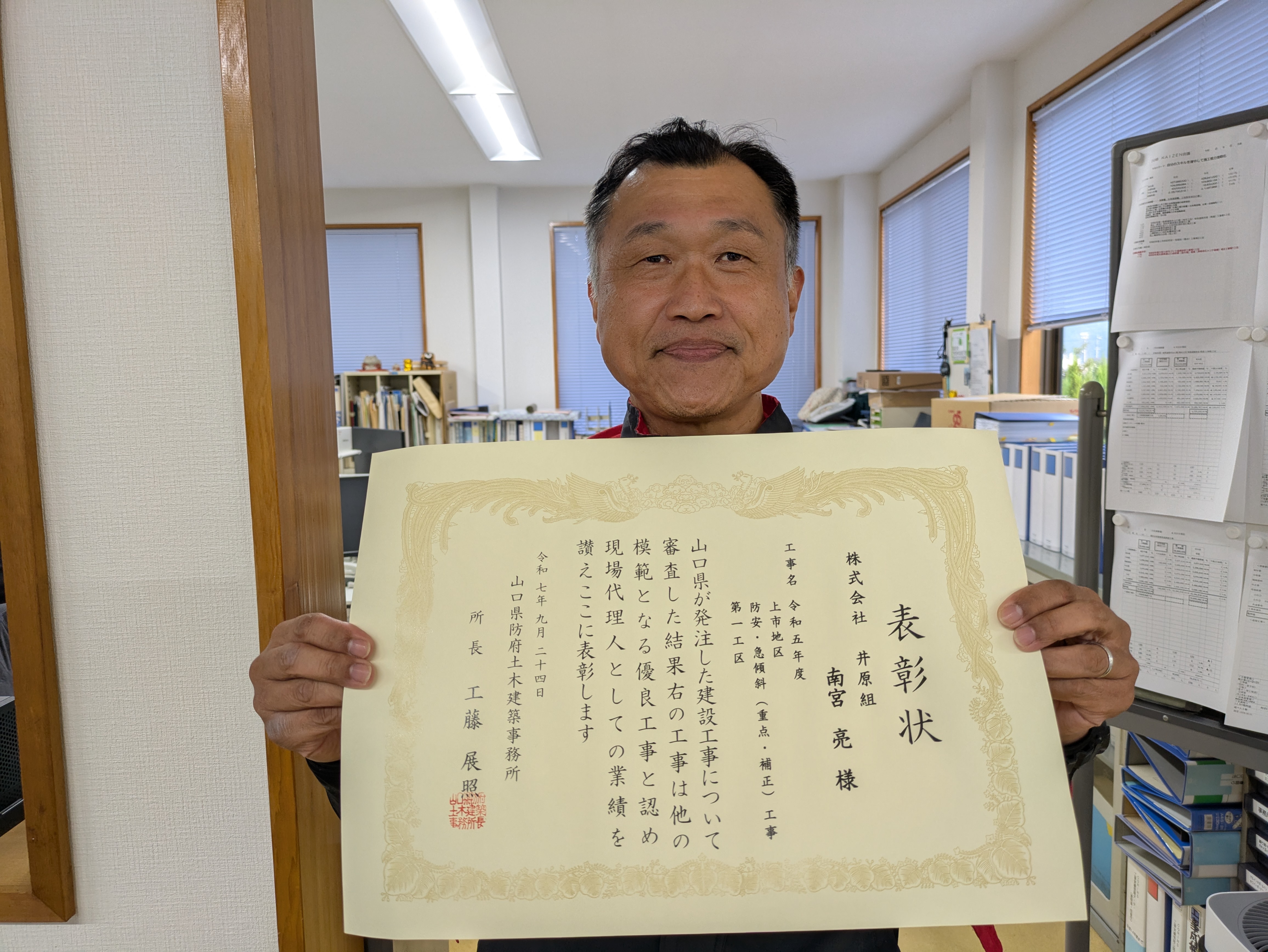 9月24日、令和6年度建設技術研修会において、防府土木建築事務所主催の優良建設工事現場代理人表彰が開催されました。 弊社が施工した、「令和5年度 上市地区 防安・急傾斜(重点・補正)工事 第1工区」が優良工事として認められ、工事を担当した現場代理人 南宮 亮 が表彰を頂きました。